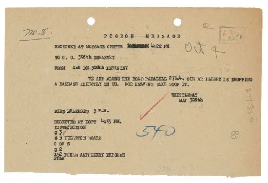 Whittlesey also attempted to alert allies of their position via homing pigeons. One pigeon, carrying the message “Many wounded. We cannot evacuate.” was shot down by the Germans. Other pigeons were stymied in their attempt to sound the alarm.
