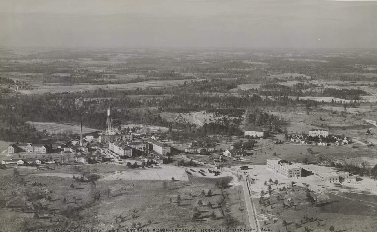 An aerial view of the historic Tuskegee VA hospital campus. It was established in 1923 specifically to treat Black veterans on land donated by nearby Tuskegee Institute, now Tuskegee University.