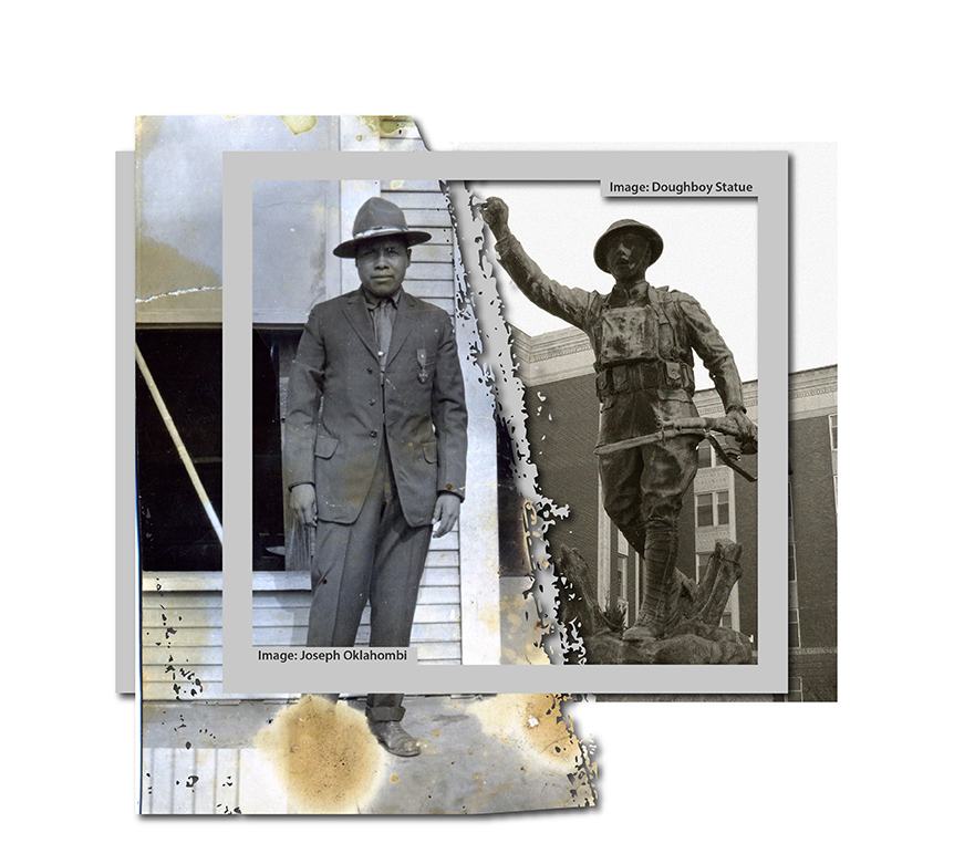“The Spirit of the American Doughboy” statue and WW1 Veteran Joseph Oklahombi. The statue is dedicated to the Five Civilized Tribes, all Native American WW1 Veterans, and Oklahombi, Choctaw Code Talker during WW1 and recipient of France’s Croix de Guerre (one of four Native American Veterans with that distinction) and Silver Star with Victory Ribbon. He is the most decorated Oklahoma WW1 Veteran.