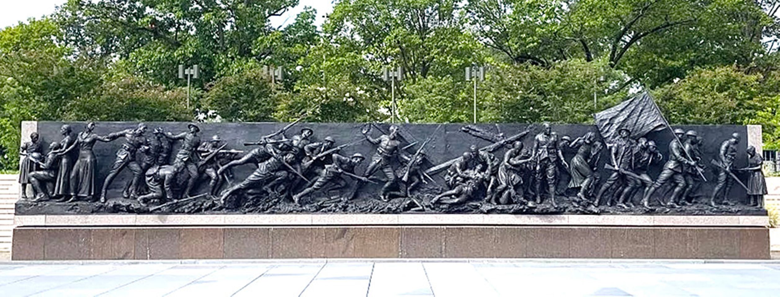 A seven-and-a-half-foot-tall bronze wall stands behind the figures, which are perched on a ledge of varying depth. The shell-shocked protagonist stands to the fore in the war-churned mire, one of his laced boots extending some three feet from the wall. Aside from a single bayonet, only the flag accompanying the returning troops rises above the wall; it extends a background diagonal from wooden war wreckage in the shape of a distorted cross. The cross appears in low relief on the wall, but no figures do. All 38 are free-standing. (Seven of them, including two battlefield nurses, are female.) Figures closer to the wall diminish in size relative to those in the foreground, as background figures rendered in low relief would in a Renaissance or Baroque work.