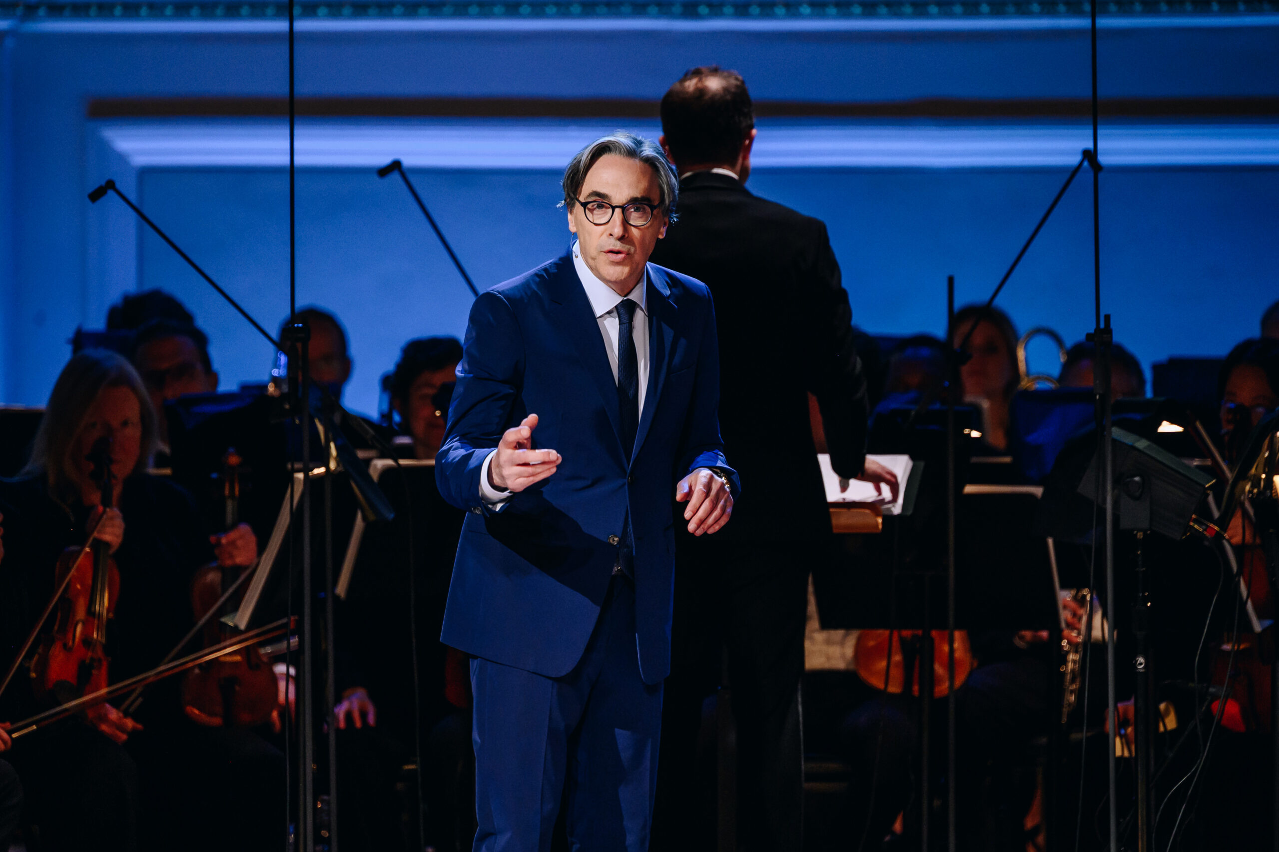 Creator and narrator of the show, historian John Monsky, with the 60-piece Orchestra of St. Luke’s. (Credit: Nina Westervelt)