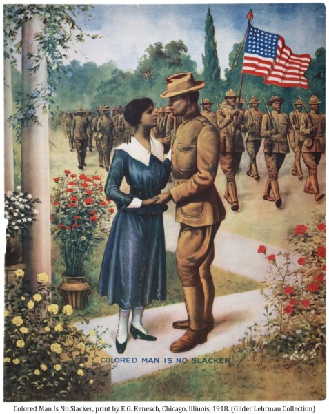 Units of the US military were segregated at that time, as were most aspects of American life. The US Army promoted black military service on posters with the slogan “Colored Man is no Slacker.” Under the presidency of Woodrow Wilson, segregation was the de facto practice in many government agencies. The introduction of photo requirments on job applications meant that African Americans experienced more discrimination than before in the federal government. In the military, most Black troops were denied the opportunity to participate in combat duty or to hold any positions of leadership. Among the rare exceptions was Carlos J. Boggs, of Ray City, GA, who served with the 367th Infantry, “the Buffalo Infantry,” 92nd Division.