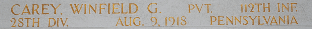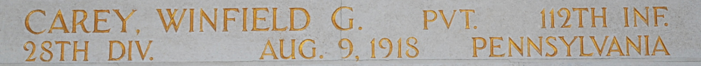 Private Winfield Carey was born on November 26, 1896, in Shippensburg, Pennsylvania. He enlisted in the Pennsylvania National Guard on July 9, 1917, and was assigned to Company C, 8th Infantry Regiment. The Pennsylvania National Guard was reorganized for active service, and his unit became the 112th Infantry Regiment, part of the 28th Division. He arrived in France in May 1918, arriving early enough to take part in the Second Battle of the Marne in July.