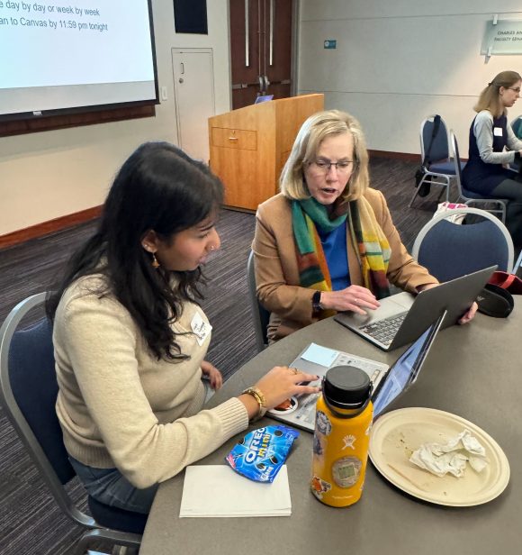 (left to right) Amala Rajagopal (‘25 History and Philosophy, Women’s and Gender Studies minor) and Dr. Jennifer Keene (History) collaborating at a WIRE workshop in January 2025.