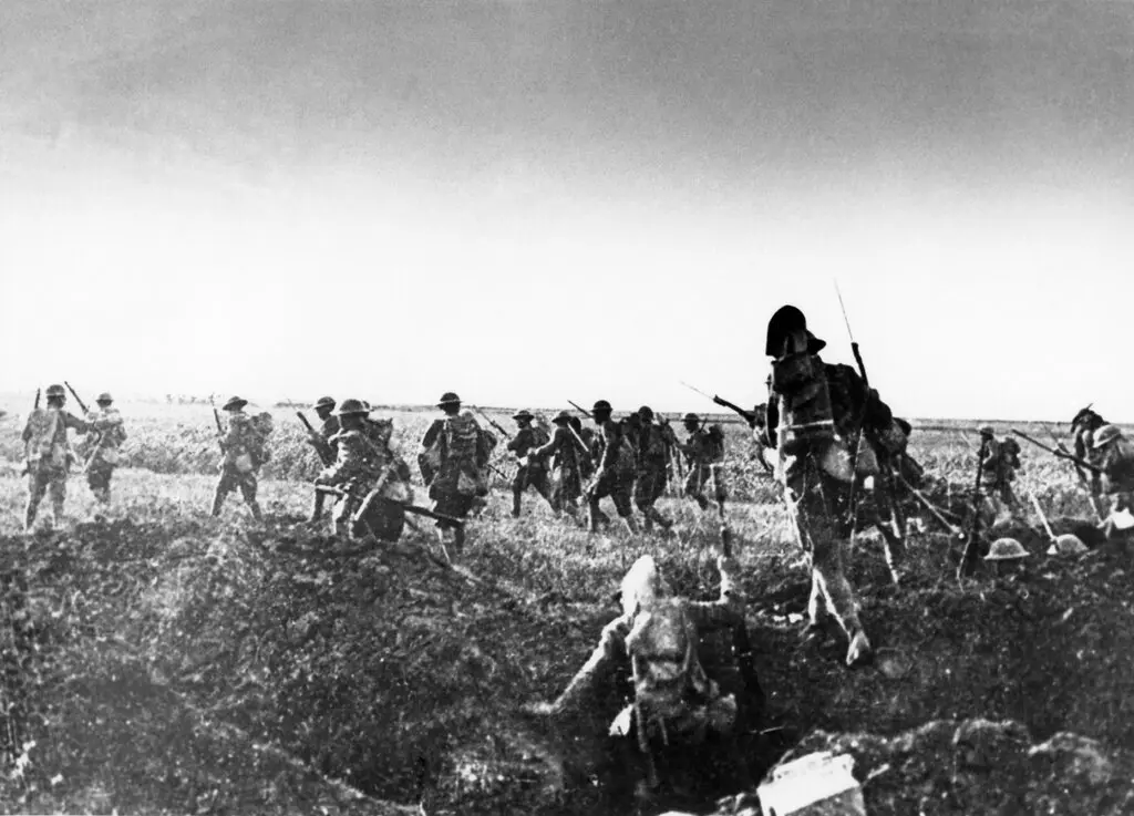 Soldiers from the 28th Infantry Regiment going over the top of trenches during the Battle of Cantigny on May 28, 1918. (Credit…Associated Press)