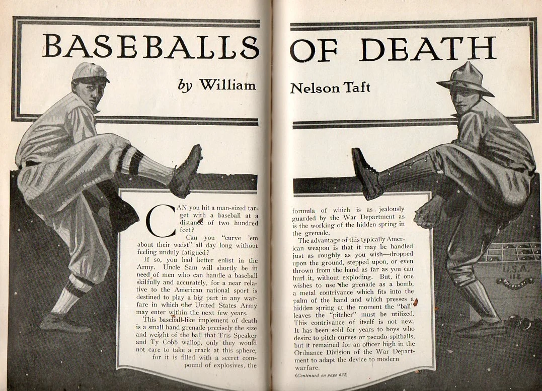 In World War I, “baseball grenades” were an experimental concept relying on the logic that since many young men of the generation grew up playing on sandlots, then they would be equally capable of throwing a baseball-shaped hand grenade with precision. Photo courtesy of the website JF Ptak Science Books.