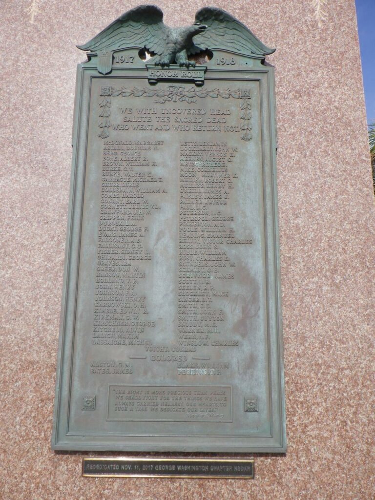The bronze and granite memorial commemorates the local soldiers who died in World War I. It features a bronze plaque depicting an eagle and displaying a list of names, all set within a granite block.