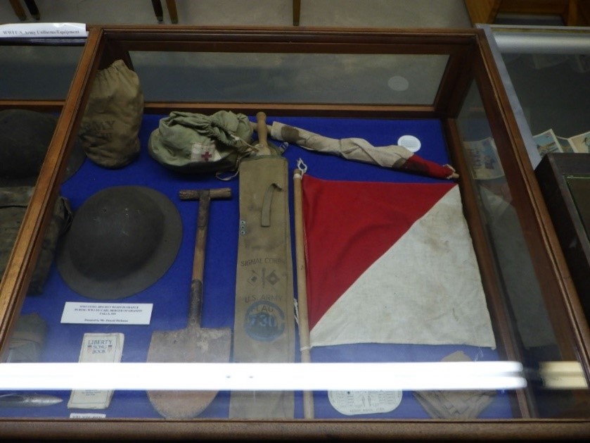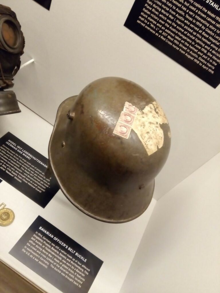 This German helmet was mailed from Italy to Austin, TX in 1919 by Gladys Lucy Harris, a Red Cross Nurse who served at Base Hospital 102 in Italy during WW1. She had found this helmet by the Piave River and stuck stamps and an address label on the helmet and put it in the mail to a ”Mrs.L” at 307 West 19th Street in Austin.