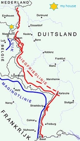 The Westwall (or Siegfried Line with the Allies) was a German defensive line that was built just before and during World War II and runs from Cleves, on the Dutch border, to the Swiss border.