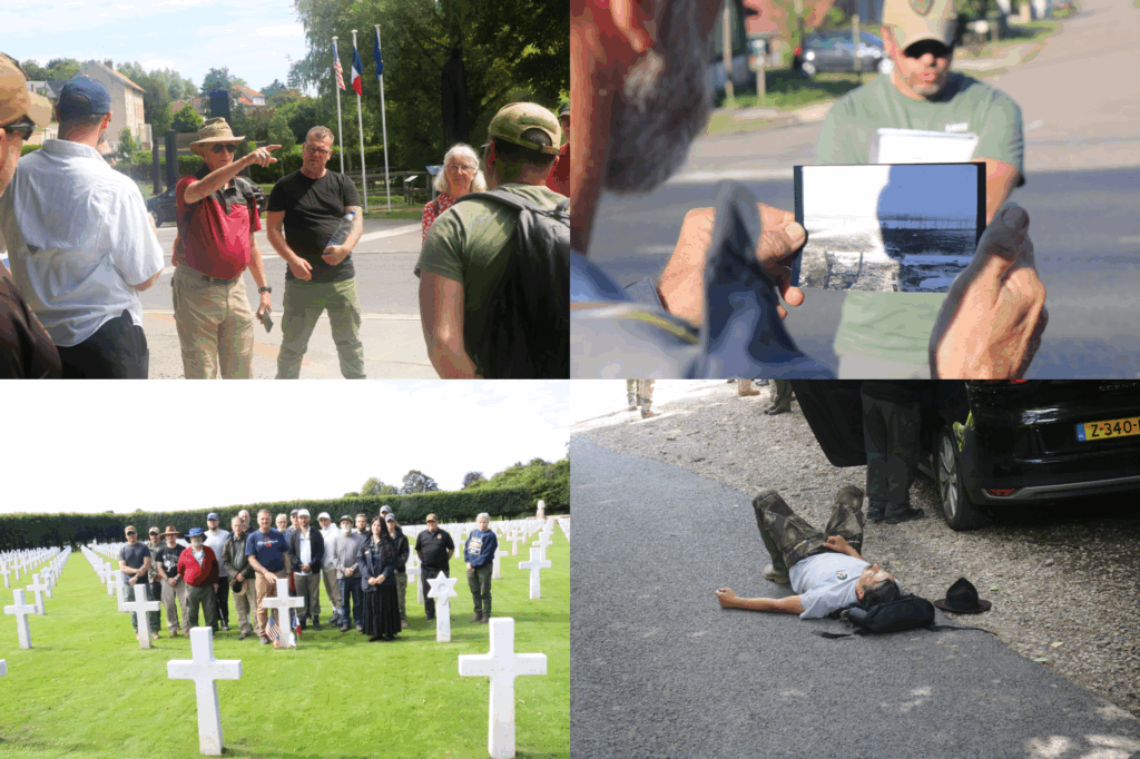 (Top Left) At Lost Battalion Tours, it’s all about sharing. Here USMC COL (Ret.) William Anderson shares his knowledge about the Fismes battle. (Top Right) Standing right where history happened. Samogneux village on the Meuse. (Bottom Left) Lost Battalion Tours 2025 at the Saint Mihiel American Cemetery. (Bottom Right) What an overload of history can sometimes do to folks. 🤣