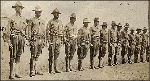 Native Code Talkers: Choctaw Soldiers, Camp Merritt, New Jersey-From left: Cpl. Solomon Bond Louis, Pvt. Mitchell Bobb, Cpl. James Edwards, Cpl. Calvin Wilson, Pvt. George (James) Davenport, Cpt. Elijah W. Horner. Image: Indiana University Museum of Archaeology and Anthropology.