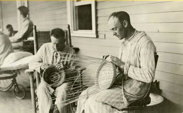 Recuperating soldiers weave baskets on the porch at Walter Reed General Hospital in Washington, D.C., c. 1918. Arts and crafts activities helped patients improve their fine motor skills and powers of concentration. (National Museum of Health and Medicine)
