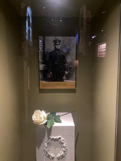 On October 24th, 1921, the remains of four unknown soldiers were exhumed from grave sites at four American cemeteries in France: Aisne-Marne, Meuse-Argonne, Somme, and St. Mihiel. The four unknown soldiers were taken to the Hôtel de Ville (City Hall) of Chalons-sur-Marne. One of the four would be chosen to be entombed at the Tomb of the Unknown Soldier at Arlington National Cemetery in Virginia. Sergeant Edward F. Younger was honored with the task of selecting the soldier. With a spray of white roses given to him by a French father who had lost two sons in the war, he walked around the four caskets several times. He stopped at one of them and laid the white roses on the chosen unknown soldier. He stepped back from the casket, saluted the unknown soldier, and stepped aside.