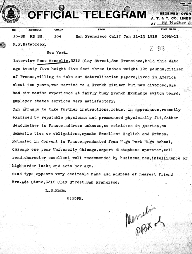 First, Renee was an exceedingly intelligent woman and a quick study. She learned French well enough to pass as a native speaker. As an aside, she also spoke fluent Spanish. Renee was an outstanding telephone operator, although she had not worked in the profession nearly as long as some of her comrades. As late as 1916, she had been working as an interpreter and secretary. Renee was so proficient an operator that she was one of only four supervisors in the first group of women to go to France. She was later promoted to Chief Operator in November of 1918.