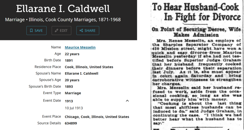 A woman in Chicago named Ellarane Caldwell had married Maurice Messelin in 1913. While the record found didn’t show her parents’ names or her birthdate, Maurice Messelin was Renee’s husband in 1916 when the newspaper reported on their divorce.