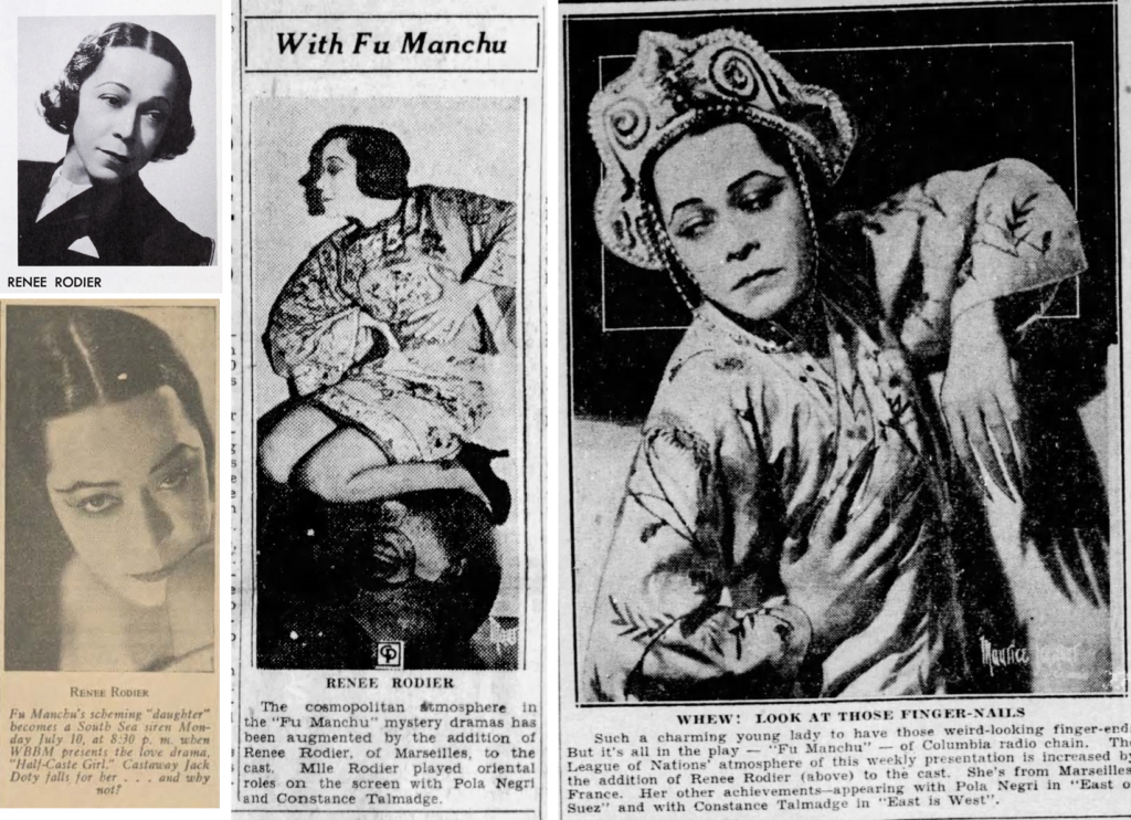 Photos of Renee Rodier during her show business career. Top left: pictured in the “AFRA antics” published by the American Federation of Radio Artists, Chicago Local, April, 1950. Bottom left: pictured in the July 9-15, 1933 issue of Radio Guide magazine. Center: advertisement published in the January 1933 Evansville, IN newspaper. This picture, or cropped versions of this picture, with this text ran in newspapers across the United States, often under the title “Exotic” Right: photo of Renee in costume published in the January, 1933 issue of the Toronto newspaper.