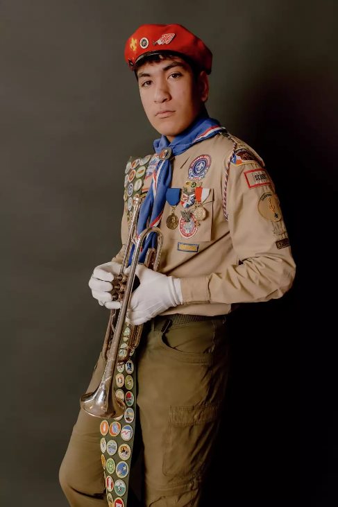 And when he’s not blowing people’s minds with his S.E. Shires B-flat trumpet, he’s wowing them with his sash full of all 135-plus merit badges one can earn as an Eagle Scout.