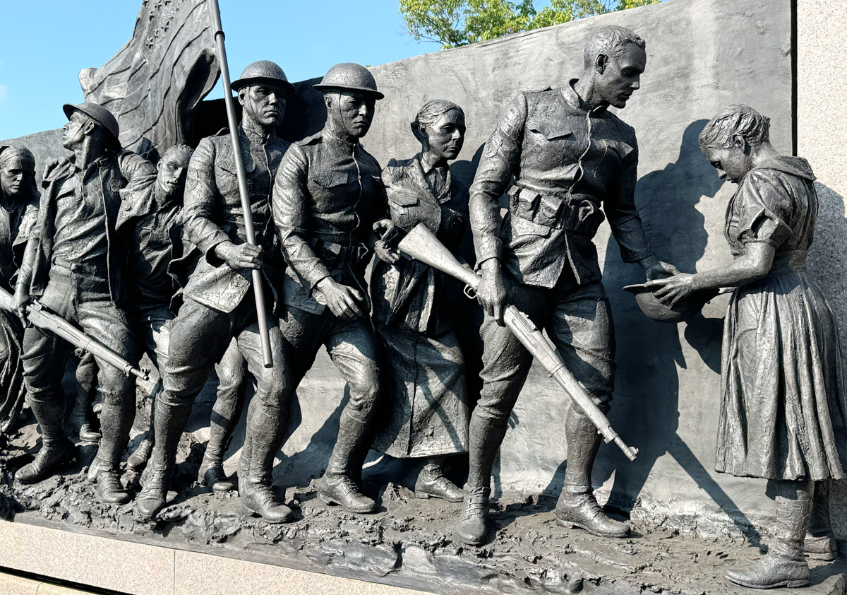 Sabin Howard's 58-foot-long bronze sculpture titled A Soldier’s Journey was unveiled during the illumination ceremony that completed the National World War I Memorial in Washington, DC on September 13, 2024.