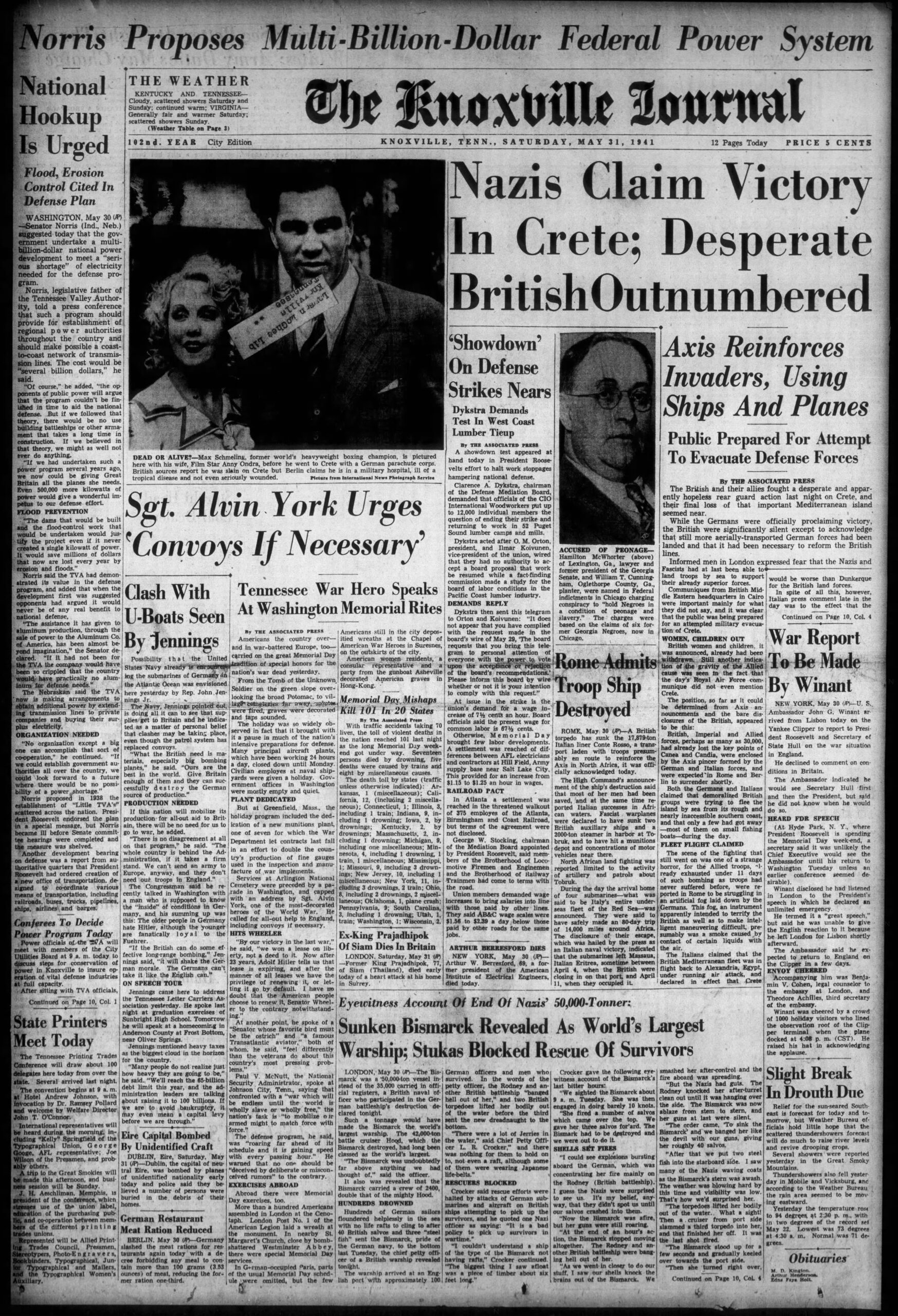 Sgt. Alvin’s York’s Memorial Day 1941 speech at Arlington National Cemetery was Page 1 news in the Knoxville Journal on May 31, 1941. (Courtesy Newspapers.com)