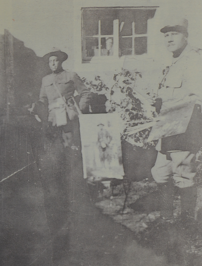 Raymond Desvarreux (right) displays his 1917 portrait of American soldier Otis W. Leader (left), who was Chickasaw, Choctaw, Cherokee, and Irish. Desvarreux noted “Who better to represent the Americans than an American Indian?”