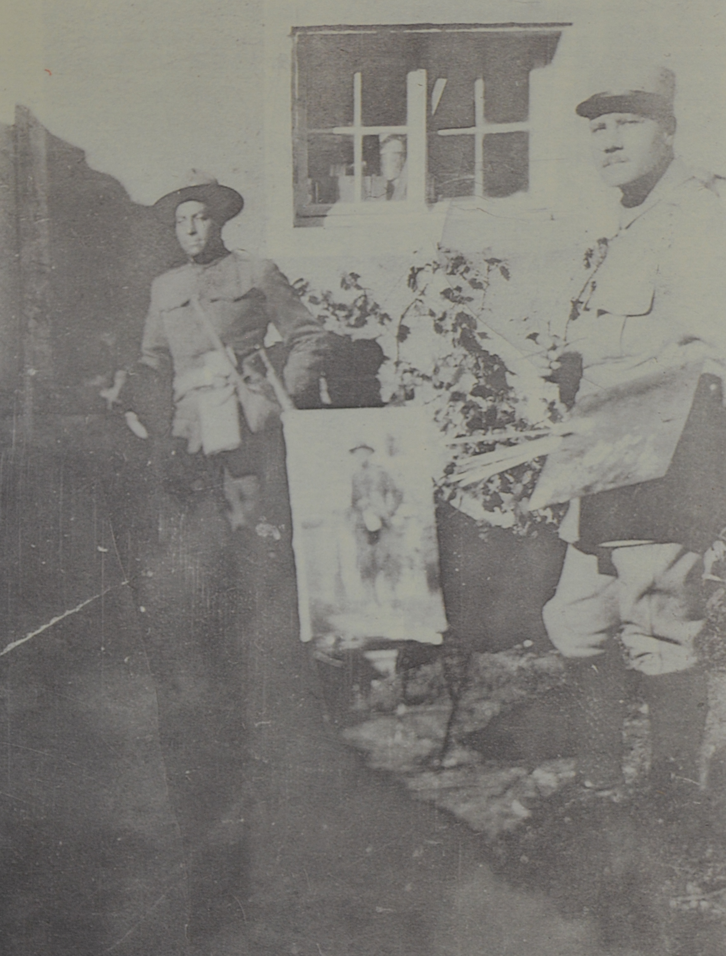 Raymond Desvarreux (right) displays his 1917 portrait of American soldier Otis W. Leader (left), who was Chickasaw, Choctaw, Cherokee, and Irish. Desvarreux noted “Who better to represent the Americans than an American Indian?”