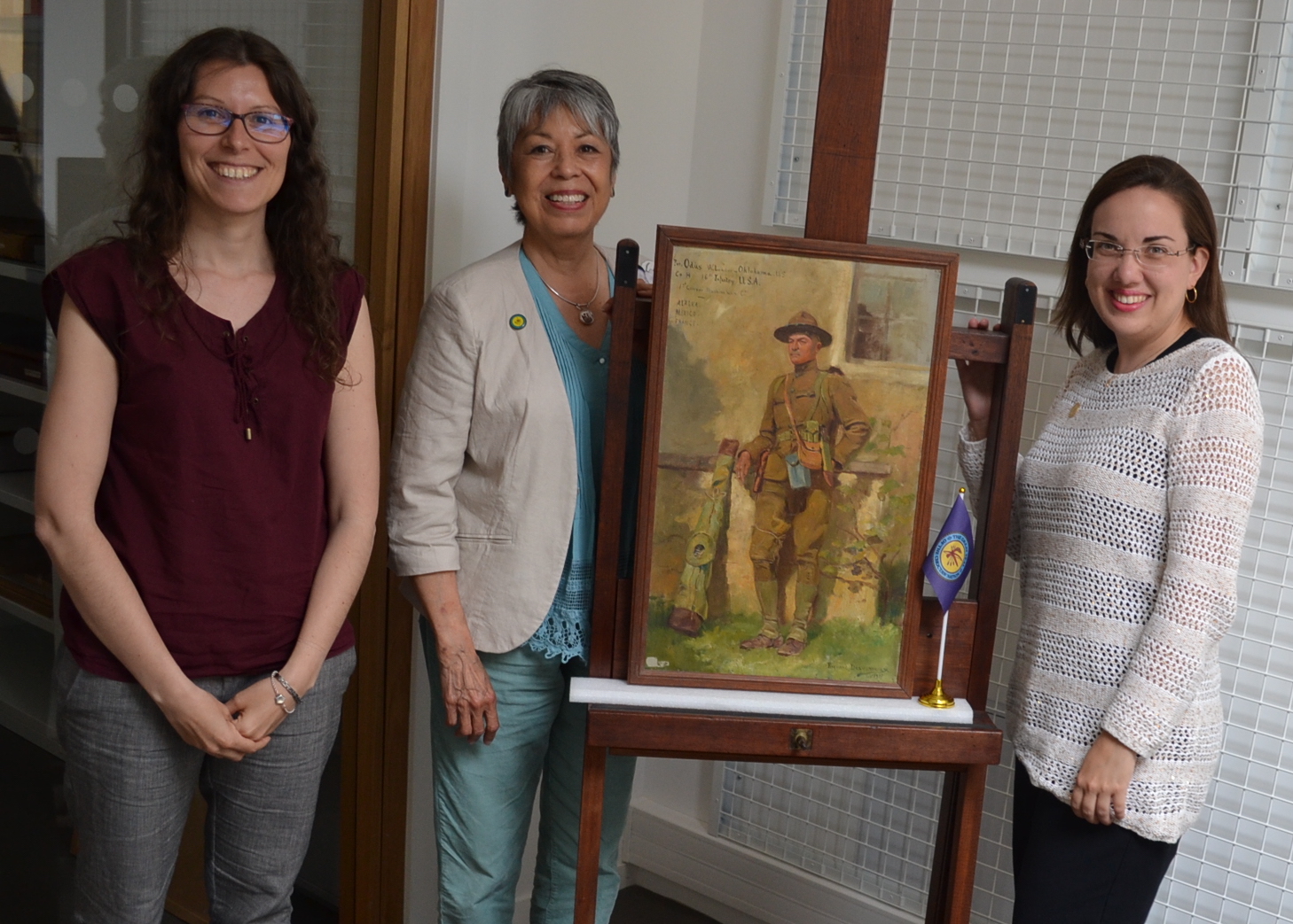 (l to r) Musée de l’Armée – Hôtel National des Invalides staff member Laëtitia Desserrières, Choctaw tribal researcher Tiajuana Cochnauer, and author Sarah Elisabeth Sawyer pictured with the original of artist Raymond Desvarreux’s portrait of Otis W. Leader as the “ideal American Doughboy.”