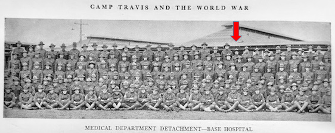 The historical facts at this time have my father moved to the newly constructed Camp Travis, just outside of San Antonio Texas. Within the record of “Camp Travis, and its part in the world war – Texas 1918” is a photograph of renamed Pvt. Louis Quiroz. The camp photo has my father within the Medical Detachment-Base Hospital, and not surprising of the times and at 5’6” he was placed in the last row of the detachment and barely visible but for his issued campaign hat.