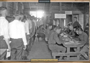 “What is now the Southbound Restaurant (5394 Peachtree Road) in Chamblee, they exited the train, and crossed the street to the general store and post office. Welcome to Camp Gordon. The camp would eventually get their own train stop. The new men are greeted by officers.”