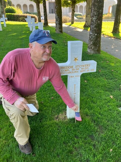 Corporal Freddie Stowers was killed rallying his compatriots to complete their mission. He was awarded the French Croix-de-Guerre by the French Army. He was awarded the Congressional Medal of Honor for these actions in 2015. Steve planted another flag at his grave at the Meuse-Argonne Cemetery the next day.