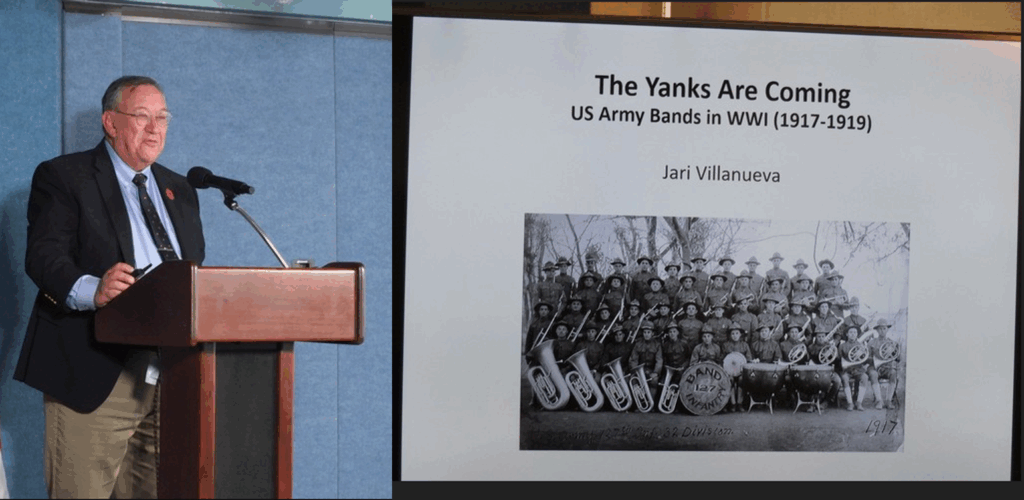 (Top row, left to right) Author Marvin Barrish told the tragic WWI story of the U.S. S. Cyclops; Author Mitch Yockelson discussed the 47 Days when Pershing’s Warriors Came of Age to Defeat the German Army in WWI; Dounghboy Foundation Chair Denise Doring VanBuren emceed the Symposium. (Middle row, left to right) Dr. Frank A. Blazich Jr. tells the soaring story of the Army Signal Corps Pigeon Service in WWI; attendees were very happy with the Symposium's programming. (Bottom right) The new AI-based "WWI Professor" made his public debut at the Symposium. (Photos (c) Bruce Guthrie)