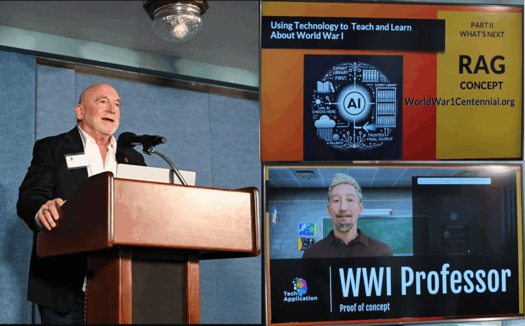Theo Mayer, a distinguished technologist, educator and WWI enthusiast, demonstrated how modern digital platforms unlock new avenues for interactive learning, bridging 1914 – 1918 with today for both classrooms and adult enthusiasts. (Photos (c) Bruce Guthrie)