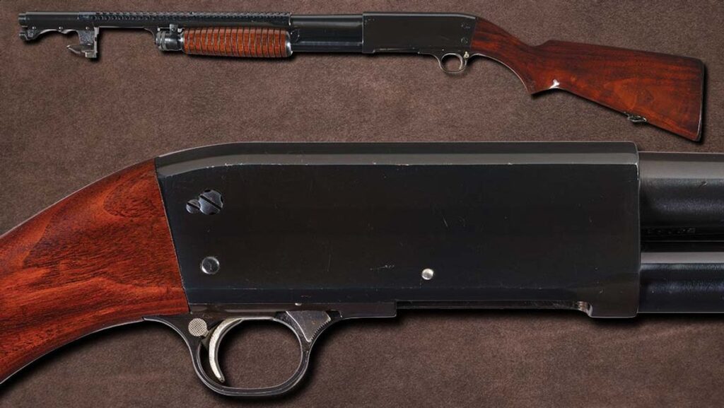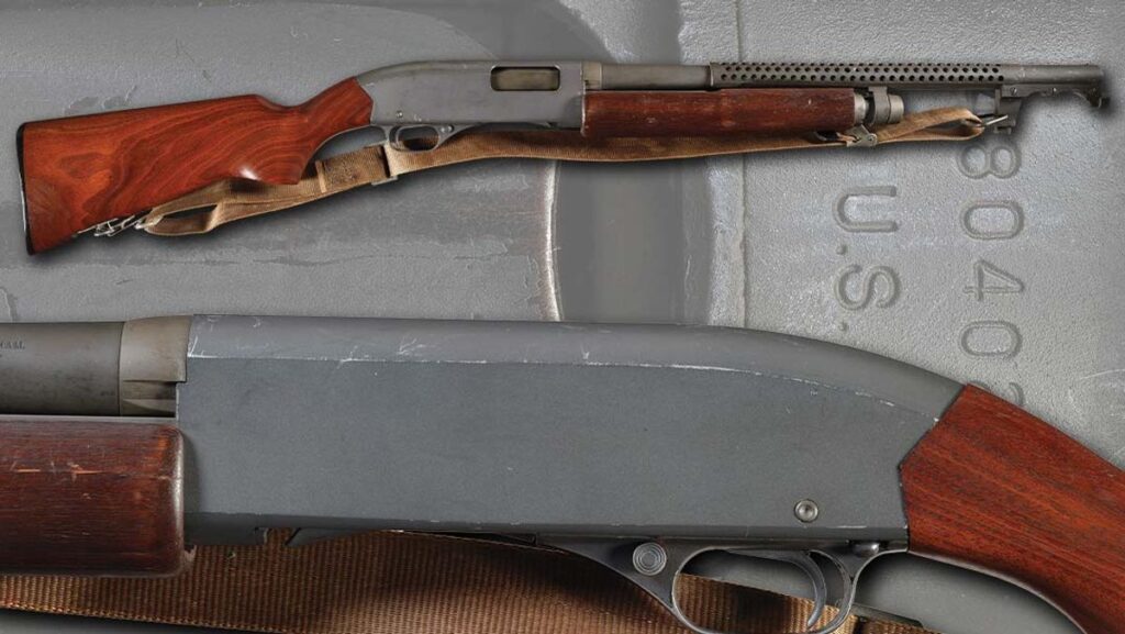 The popular civilian model Winchesters, invented by John Moses Browning, had 20-inch barrels, a sling swivel, bayonet adapter, and perforated metal heat shield over the 12-gauge barrel. The trench gun was born.